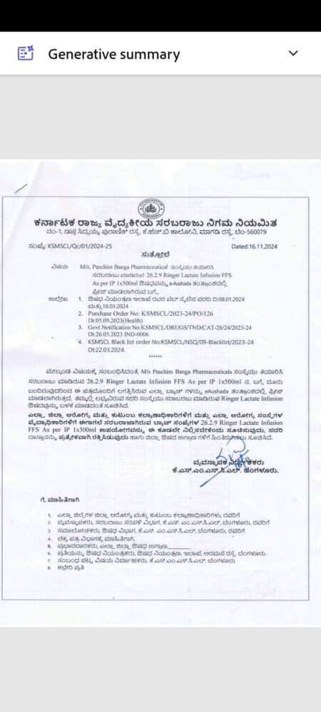 ಔಷಧಿ ಗುಣಮಟ್ಟ ಇಲಾಖೆಯು ರಾಜ್ಯದ ಎಲ್ಲ ಆಸ್ಪತ್ರೆಗಳಿಗೂ ತುರ್ತು ಸಂದೇಶ ನೀಡಿದ್ದು, 26.2.9 ringer lactate infusion FFS ಬಳಸದಂತೆ ಮಾಹಿತಿ ನೀಡಲಾಗಿದೆ. ಗ್ಲುಕೋಸ್ ಬಾಟಲಿಯಲ್ಲಿ ಕಪ್ಪು ಬಣ್ಣದ ಫಂಗಸ್ ಪತ್ತೆಯಾಗಿದೆ. ಈ ಹಿನ್ನೆಲೆಯಲ್ಲಿ ಬಳಸದಂತೆ ಸೂಚಿಸಲಾಗಿದೆ. ಹೀಗಾಗಿ ಈ ಗ್ಲುಕೋಸ್ ಸಿದ್ಧಪಡಿಸುವ PASCHIM BANGA PHARMACETICAL ಕಂಪನಿಯನ್ನು ಬ್ಲಾಕ್ ಲಿಸ್ಟ್ ಗೆ ಹಾಕಲು ಸೂಚಿಸಲಾಗಿದ್ದು, ಈ ಕುರಿತು ತನಿಖೆಗೆ ನಡೆಸುವಂತೆ ಹೇಳಲಾಗಿದೆ.