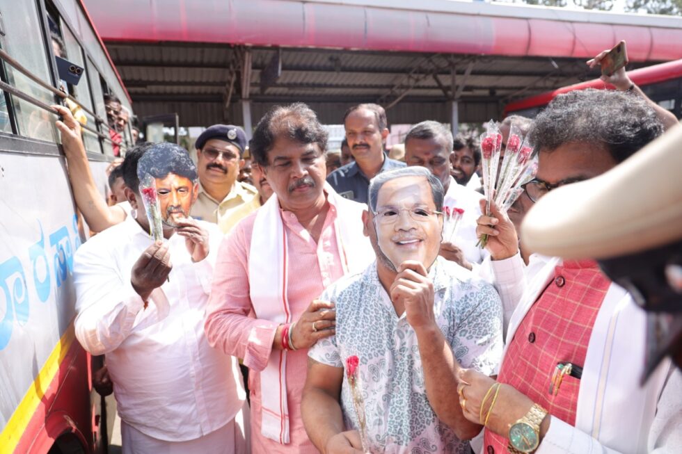 ಪ್ರತಿಭಟನೆ ಸಂದರ್ಭದಲ್ಲಿ ಸಿಎಂ ಸಿದ್ದರಾಮಯ್ಯ, ಡಿಸಿಎಂ ಡಿ.ಕೆ. ಶಿವಕುಮಾರ್ ಮುಖವಾಡ ಧರಿಸಿದ್ದರು. ಪುರುಷ ಪ್ರಯಾಣಿಕರಿಗೆ ಗುಲಾಬಿ ಹೂ ನೀಡಿ ನೀಡಿ ವಿನೂತನವಾಗಿ ಪ್ರತಿಭಟಿಸಲಾಯಿತು.