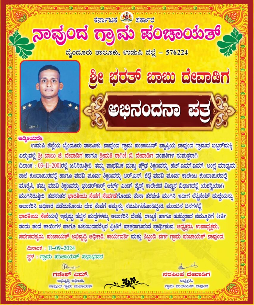 ಭಾರತೀಯ ಸೈನ್ಯಕ್ಕೆ ಲೆಪ್ಟಿನೆಂಟ್ ಆಗಿ ಆಯ್ಕೆಗೊಂಡ ಭಾರತಾಂಬೆಯ ಹೆಮ್ಮೆಯ ಪುತ್ರ ಭರತ್ ಬಾಬು ದೇವಾಡಿಗರಿಗೆ ಹುಟ್ಟೂರಿನ ಜನರು, ಗ್ರಾಮ ಪಂಚಾಯತ್ ವತಿಯಿಂದ ಸನ್ಮಾನಿಸಿ ಅಭಿನಂದನೆ ಸಲ್ಲಿಸಿದರು.
