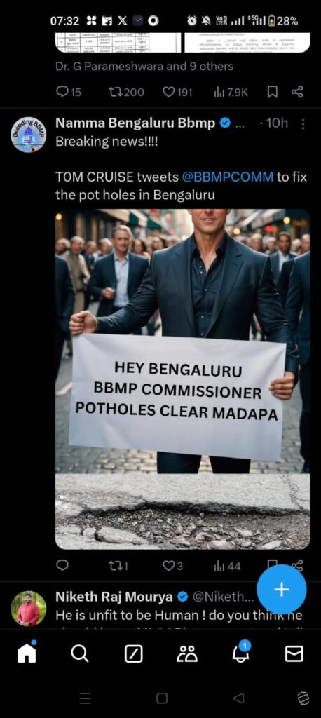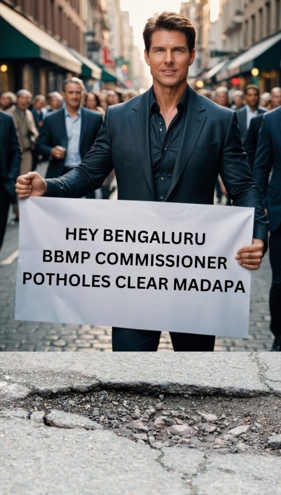 ಬಿಬಿಎಂಪಿ ಕಮಿಷನರ್ ಗೆ ಟ್ಯಾಗ್ ಮಾಡಿ tom cruise ಫೋಟೊ ಸಮೇತ ಪೋಸ್ಟ್ ಮಾಡಿದ್ದಾರೆ. ಬಿಬಿಎಂಪಿ ಕಮಿಷನರ್ ಗುಂಡಿ ಮುಚ್ಚರಪ್ಪ ಅಂತ ಪೋಸ್ಟ್ ನಲ್ಲಿ ಬರೆದಿದ್ದಾರೆ. ಈ ಫೋಟೋ ಈಗ ಜಾಲತಾಣದಲ್ಲಿ ವೈರಲ್ ಆಗುತ್ತಿದೆ.
