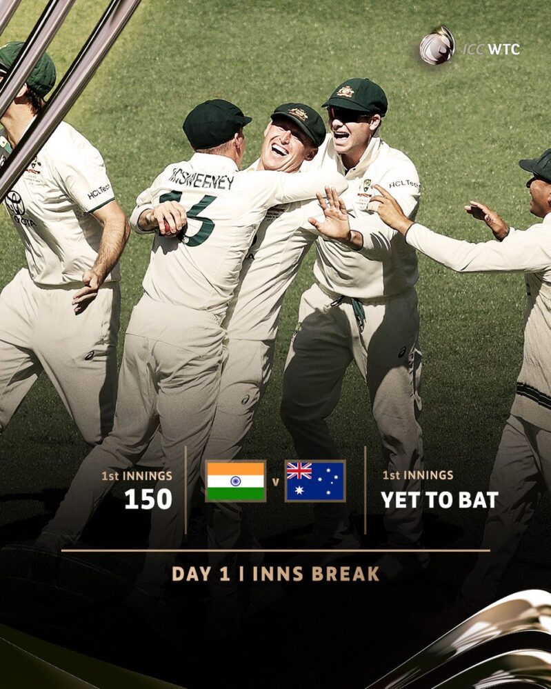 ಭಾರತ ತಂಡ ತನ್ನ ಮೊದಲ ಇನ್ನಿಂಗ್ಸ್ ನಲ್ಲಿ 49.3 ಓವರ್ ಗಳಲ್ಲಿ 150 ರನ್ ಗಳಿಗೆ ಆಲೌಟ್ ಆಯಿತು. ಭಾರತದ ಪರ ನಿತೀಶ್ ರೆಡ್ಡಿ ಗರಿಷ್ಠ 41 ರನ್ ಗಳಿಸಿದರೆ, ರಿಷಭ್ ಪಂತ್ 37 ರನ್ ಹಾಗೂ ಕೆಎಲ್ ರಾಹುಲ್ 26 ರನ್ ಗಳಿಸಿದರು.