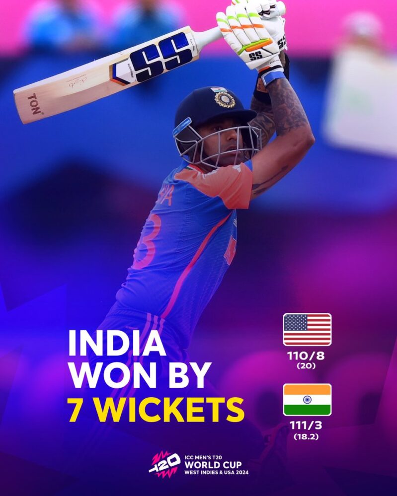 ಆತಿಥೇಯ ಅಮೆರಿಕ ತಂಡವನ್ನು (IND vs USA) 7 ವಿಕೆಟ್‌ ಗಳಿಂದ ಮಣಿಸಿ ಸೂಪರ್ 8 ಸುತ್ತಿಗೆ ಪ್ರವೇಶಿಸಿದೆ. ಪಂದ್ಯದಲ್ಲಿ ಮೊದಲು ಬ್ಯಾಟ್ ಮಾಡಿದ ಅಮೆರಿಕ 20 ಓವರ್‌ಗಳಲ್ಲಿ ಎಂಟು ವಿಕೆಟ್‌ ಕಳೆದುಕೊಂಡು 110 ರನ್ ಗಳಿಸಿತ್ತು. ಸವಾಲು ಬೆನ್ನಟ್ಟಿದ್ದ ಭಾರತ ತಂಡಕ್ಕೆ ಆರಂಭಿಕ ಆಘಾತ ಎದುರಾಯಿತು. ಆದರೂ ಭಾರತ ತಂಡ 18.2 ಓವರ್‌ ಗಳಲ್ಲಿ 3 ವಿಕೆಟ್ ಕಳೆದುಕೊಂಡು ಗೆಲುವು ಸಾಧಿಸಿತು.