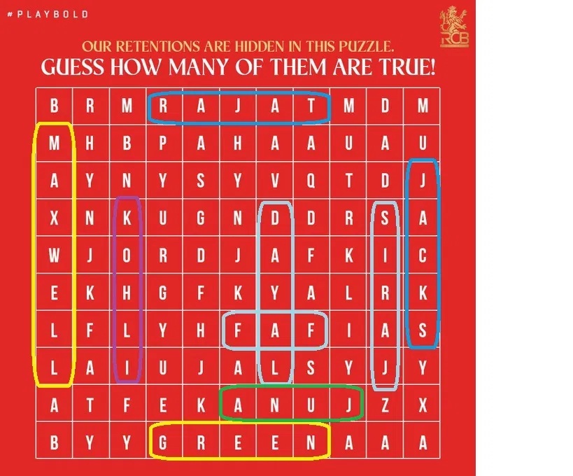 ಈಗಾಗಲೇ ಇದಕ್ಕಾಗಿ ಫಜಲ್ ಬಿಡುಗಡೆ ಮಾಡಿದೆ. ಪಝಲ್ ಗೇಮ್ನಲ್ಲಿ ತಂಡ ಉಳಿಸಿಕೊಳ್ಳಬಹುದಾದ ಆಟಗಾರರ ಹೆಸರನ್ನು ಅಡಗಿಟ್ಟಿಸಿದೆ. ಅದರಲ್ಲಿ ಹುಡುಕಿದಾಗ ಒಟ್ಟಾರೆ 8 ಆಟಗಾರರ ಹೆಸರು ಪತ್ತೆಯಾಗಿದೆ. ಆದರೆ ಫ್ರಾಂಚೈಸಿಯೊಂದು ತಂಡದಲ್ಲಿ ಉಳಿಸಿಕೊಳ್ಳಬಹುದಾದ ಆಟಗಾರರ ಸಂಖ್ಯೆ 6 ಮಾತ್ರ. ಹೀಗಾಗಿ ಯಾರನ್ನು ಉಳಿಸಿಕೊಳ್ಳಬಹುದು ಎಂಬ ಚಿಂತೆ ಈಗ ಆಟಗಾರರನ್ನು ಕಾಡುತ್ತಿದೆ.