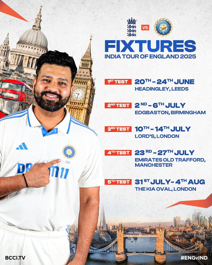 ಆನಂತರ ಭಾರತ ಹಾಗೂ ಇಂಗ್ಲೆಂಡ್ ವಿರುದ್ಧದ ಟೆಸ್ಟ್ ಸರಣಿ (Ind vs Eng Test series) ಆರಂಭವಾಗಲಿದೆ. ಎರಡೂ ತಂಡಗಳಿಗೂ ಇದು 4ನೇ ಆವೃತ್ತಿಯ ವಿಶ್ವ ಟೆಸ್ಟ್ ಚಾಂಪಿನ್ ಶಿಪ್ ಋತುವಿನ (2025-27) ಮೊದಲ ಸರಣಿಯಾಗಿರಲಿದೆ. ಎರಡೂ ತಂಡಗಳ ವಿರುದ್ಧ 5 ಟೆಸ್ಟ್ ಪಂದ್ಯಗಳು ನಡೆಯಲಿವೆ. 1 ತಿಂಗಳ ಕಾಲ ಈ ಸರಣಿ ನಡೆಯಲಿದೆ.