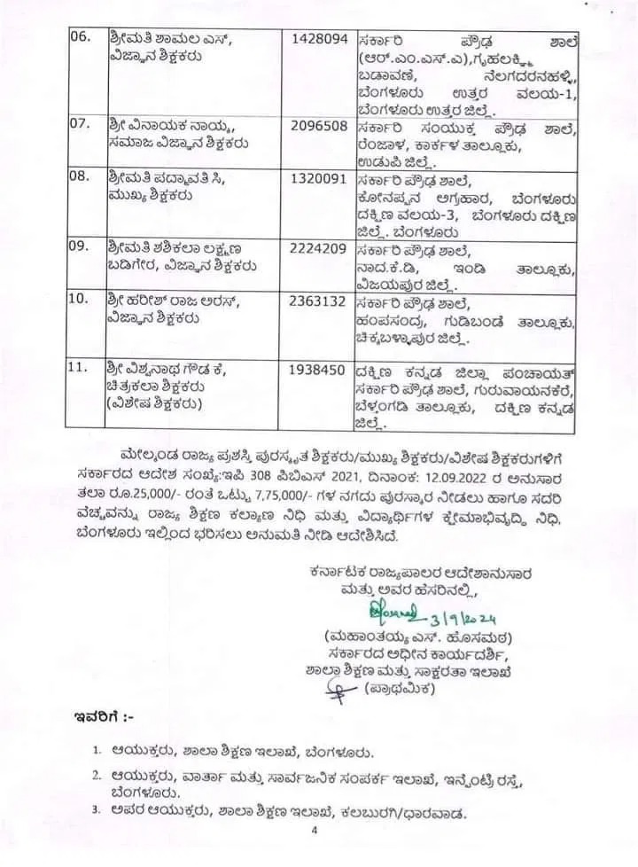 ಈ ರಾಜ್ಯ ಪ್ರಶಸ್ತಿ ಪುರಸ್ಕೃತ ಶಿಕ್ಷಕರಿಗೆ ತಲಾ ರೂ.25,000 ರೂ. ನಂತೆ ಒಟ್ಟು 7,75,000 ರೂ. ಗಳ ನಗದು ಪುರಸ್ಕಾರ ನೀಡಲು ಹಾಗೂ ಸದರಿ ವೆಚ್ಚವನ್ನು ರಾಜ್ಯ ಶಿಕ್ಷಣ ಕಲ್ಯಾಣ ನಿಧಿ ಮತ್ತು ವಿದ್ಯಾರ್ಥಿಗಳ ಕ್ಷೇಮಾಭಿವೃದ್ಧಿ ನಿಧಿ, ಬೆಂಗಳೂರು ಇಲ್ಲಿಂದ ಭರಿಸಲು ಸರ್ಕಾರ ಅನುಮತಿ ನೀಡಿದೆ.