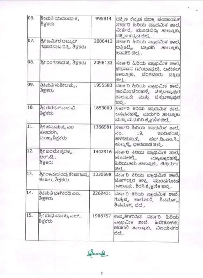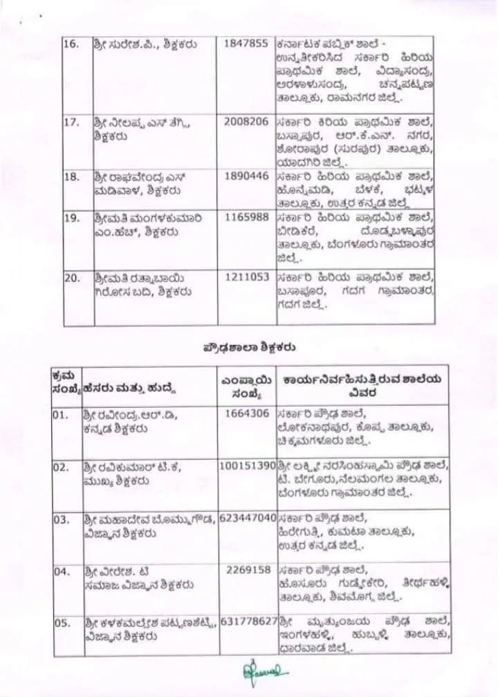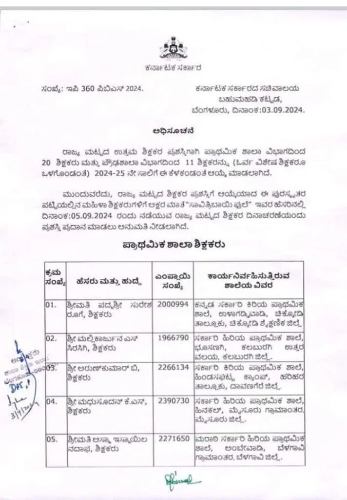 ಬೆಂಗಳೂರು: ರಾಜ್ಯ ಶಿಕ್ಷಣ ಇಲಾಖೆ ರಾಜ್ಯ ಮಟ್ಟದ ಉತ್ತಮ ಶಿಕ್ಷಕರ ಪ್ರಶಸ್ತಿ ಪಟ್ಟಿ ಪ್ರಕಟಿಸಿದೆ.