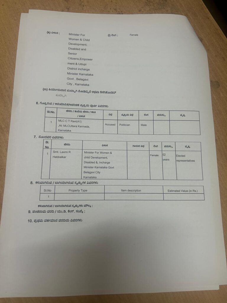 ಸದನದೊಳಿಗೆ ಅಶ್ಲೀಲ ಪದಿಂದ ನಿಂದನೆ ಮಾಡಿದ್ದಾರೆ ಎಂದು ಆರೋಪಿಸಿ ಸಚಿವ ಲಕ್ಷ್ಮೀ ಹೆಬ್ಬಾಳ್ಕರ್ ನೀಡಿದ ದೂರಿನ ಮೇಲೆಗೆ ಬಿಜೆಪಿ ಎಂಎಲ್ಸಿ ಸಿಟಿ ರವಿ ವಿರುದ್ಧ ಎಫ್ಐಆರ್ ದಾಖಲಾಗಿದೆ. ಅವಾಚ್ಯಪದ ಬಳಕೆ ಆರೋಪದ ಸಚಿವೆ ಲಕ್ಷ್ಮೀ ಹೆಬ್ಬಾಳ್ಕರ್ ತಮ್ಮದೇ ಲೆಟರ್‌ಹೆಡ್ ಮೇಲೆ ಹಿರೇಬಾಗೇವಾಡಿ ಪೊಲೀಸ್ ಠಾಣೆಗೆ ದೂರು ನೀಡಿದ್ದರು.